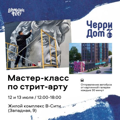 12:00-18:00 в течение дня на строительной площадке ЖК «В-Сити» будет проходить мастер-класс по стрит-арту для всех желающих. Отправление бесплатного автобуса каждые 30 минут от картинной галереи.